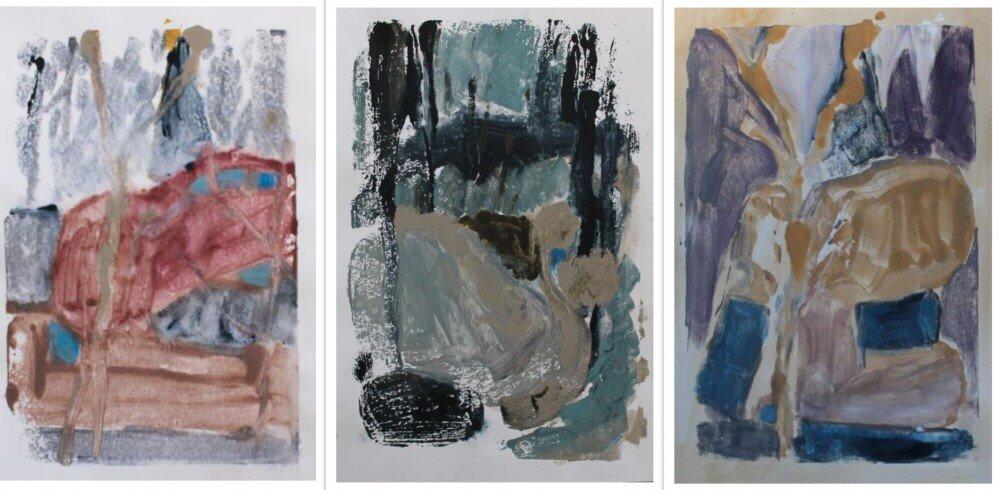 Triptych Finalist Blackstone WOP Prize. This image is the result of working en plein air in the Central West. I was at the foot of a strange mountain of conglomerate boulders made of quartz of various shades from smoky whites to greys to spots of blue. Upon returning home and researching I found the site is known for its fine quartz otherwise known as chalcedony, said to have metaphysical healing properties by absorbing negative energies and bestowing inner calm. I was intrigued by my images which intuitively seemed to have captured the waxy lustre and semi transparency of the surfaces and the harmonious spirit of the place.