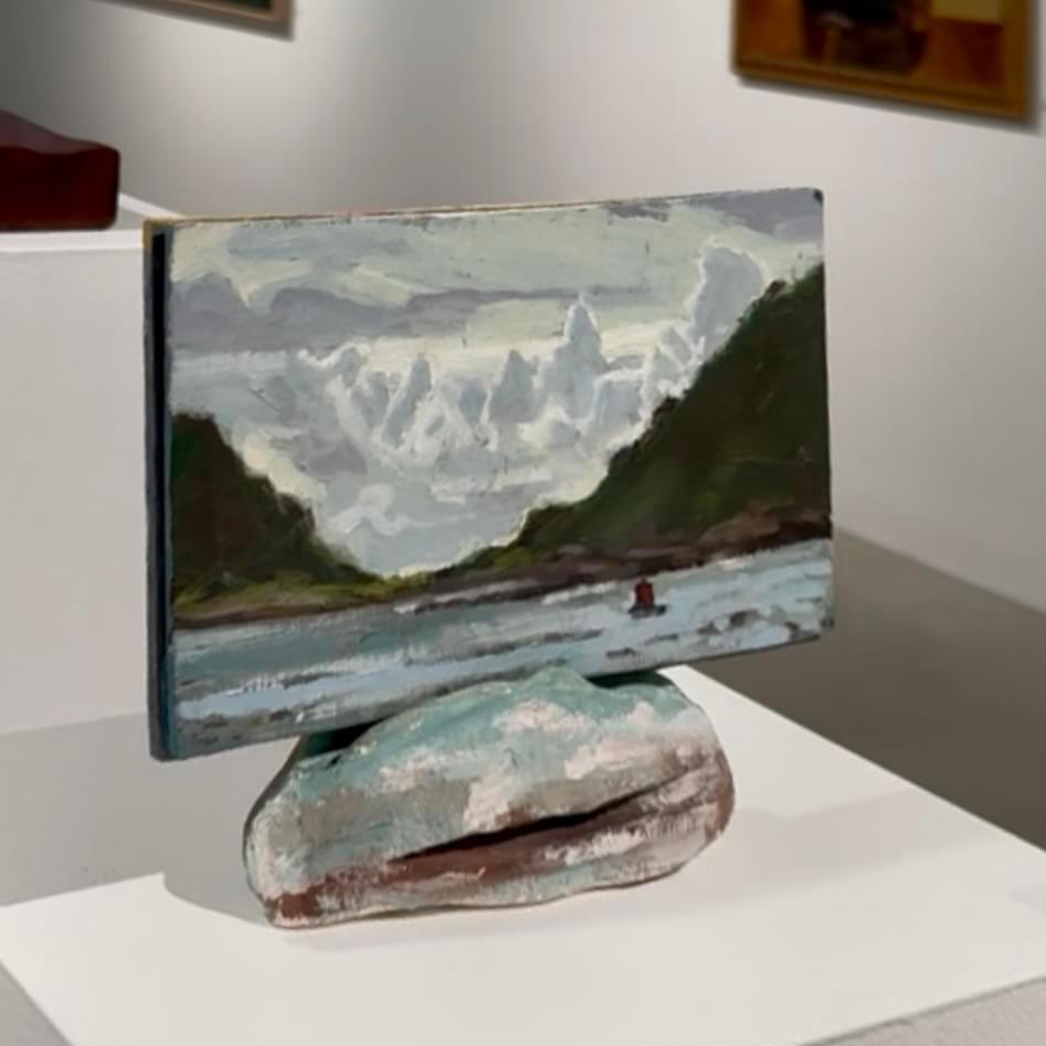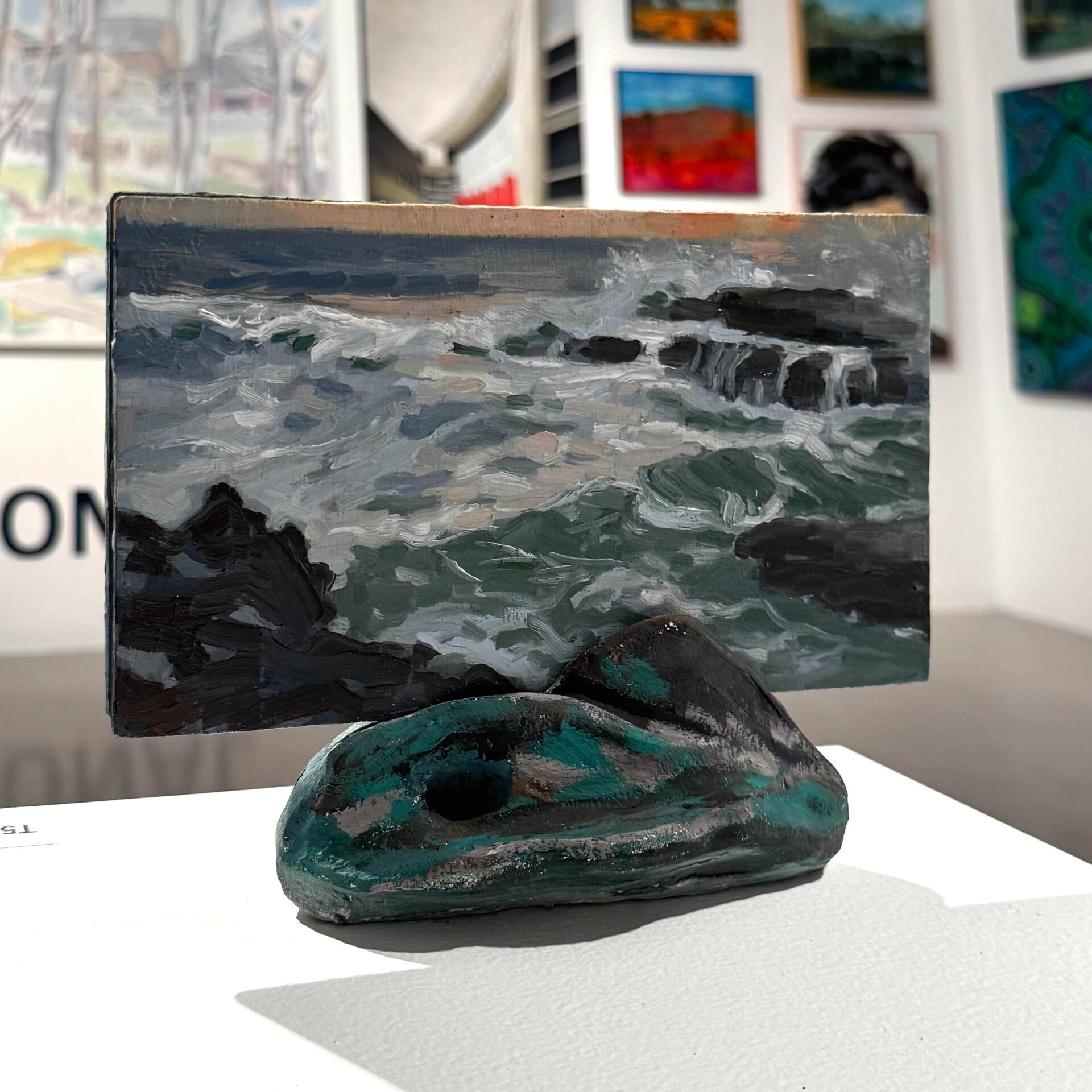 Two 9x5 plein air landscapes representing different aspects of the same place, sit embedded in a sculptúred mount as an extension of the land. This enables the work to be seen in the round, inviting investigation, and offering different entry points, like a portal into an expanded world of sea and sky.