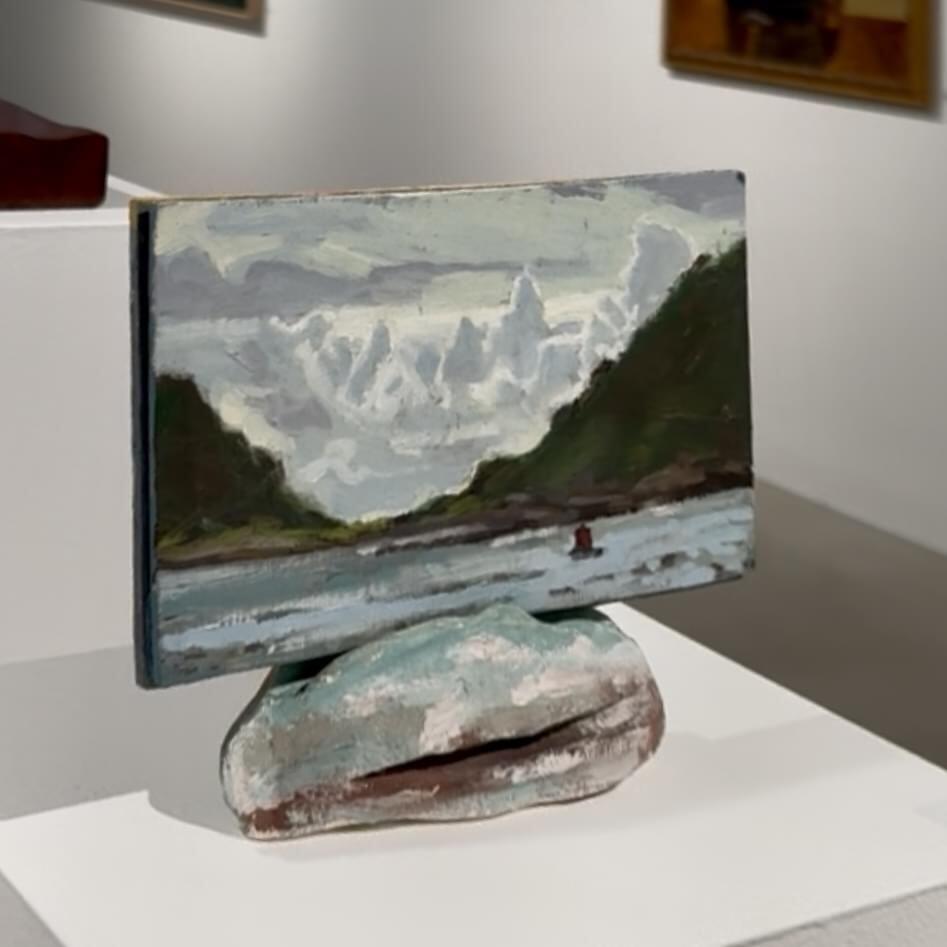 Two 9x5 plein air landscapes representing different aspects of the same place, sit embedded in a sculptúred mount as an extension of the land. This enables the work to be seen in the round, inviting investigation, and offering different entry points, like a portal into an expanded world of sea and sky.
