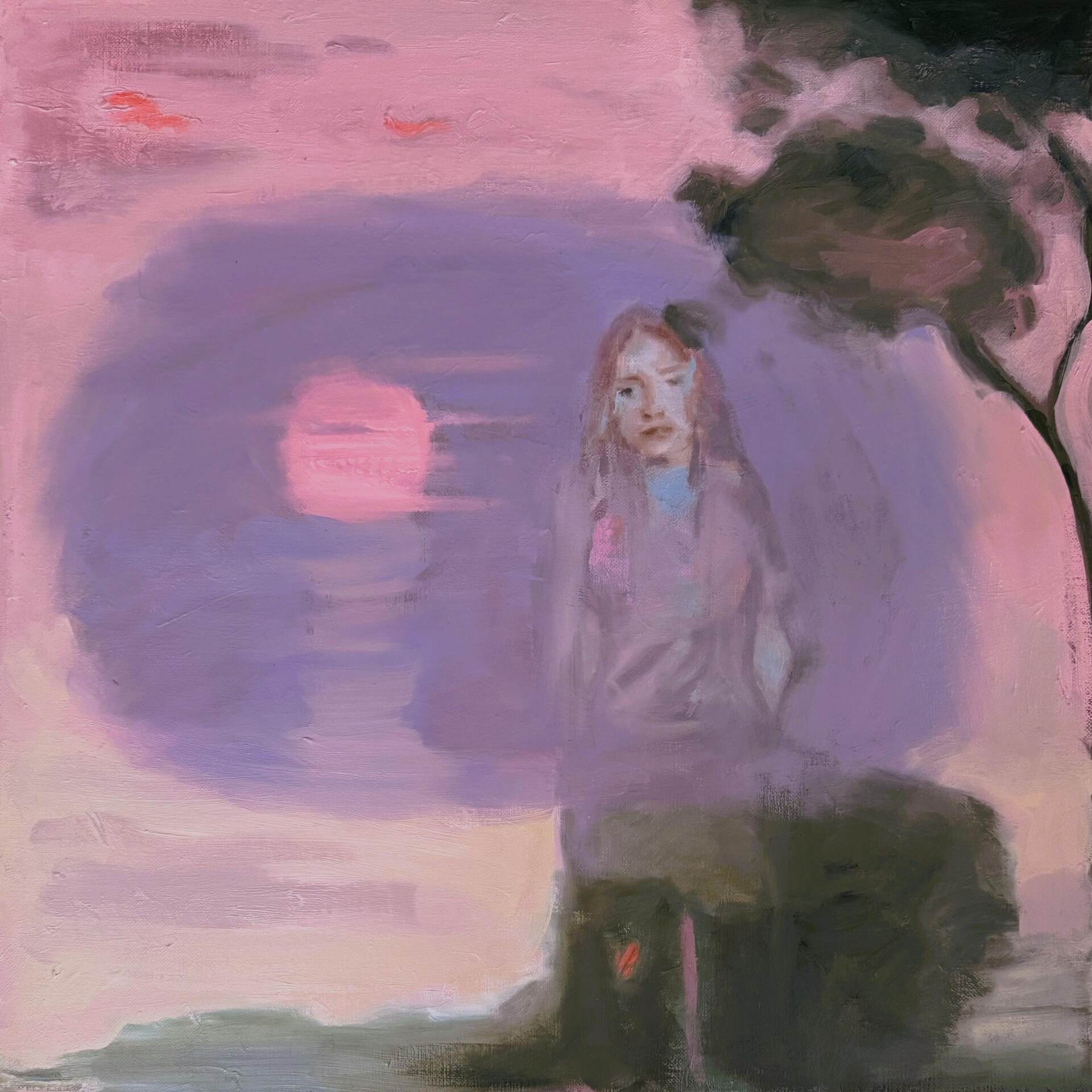 oil painting. moody poetic figure in the landscape in a wash of muted purple at sunset. Washed in space.