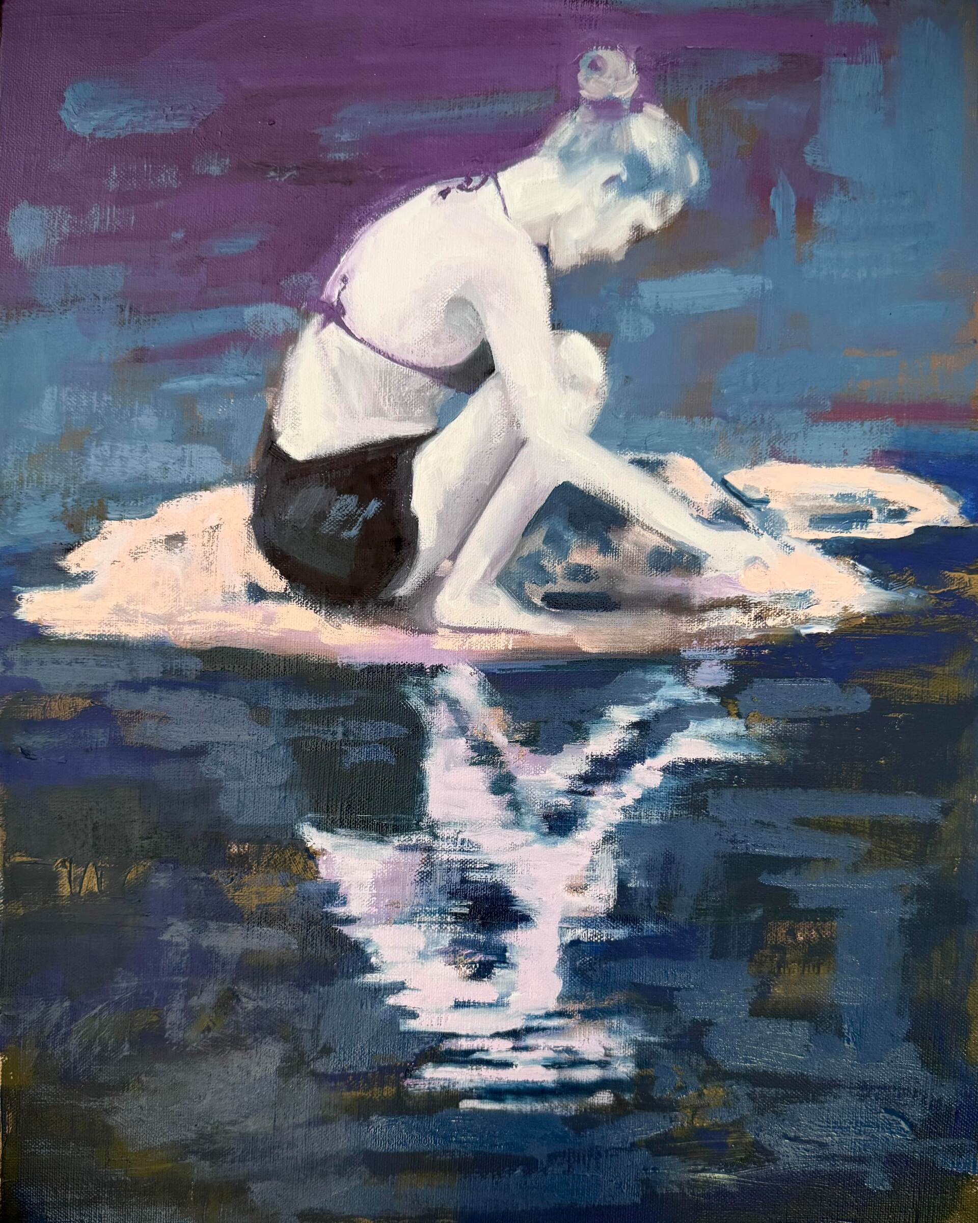 Oil painting by Australian artist of a figure in the landscape. A woman is sitting on rock reflected in the water painted in abstracted figuration in cool blues and purples